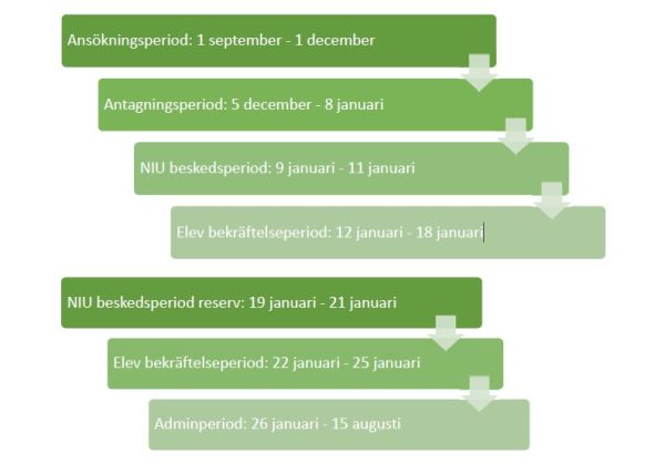 Ansökan till de idrottsutbildningarna skolan erbjuder görs vid olika datum beroende på vilka utbildning det gäller. Läs noga vad som gäller för den utbildning du vill gå så att du kommer ihåg att ansöka i tid.